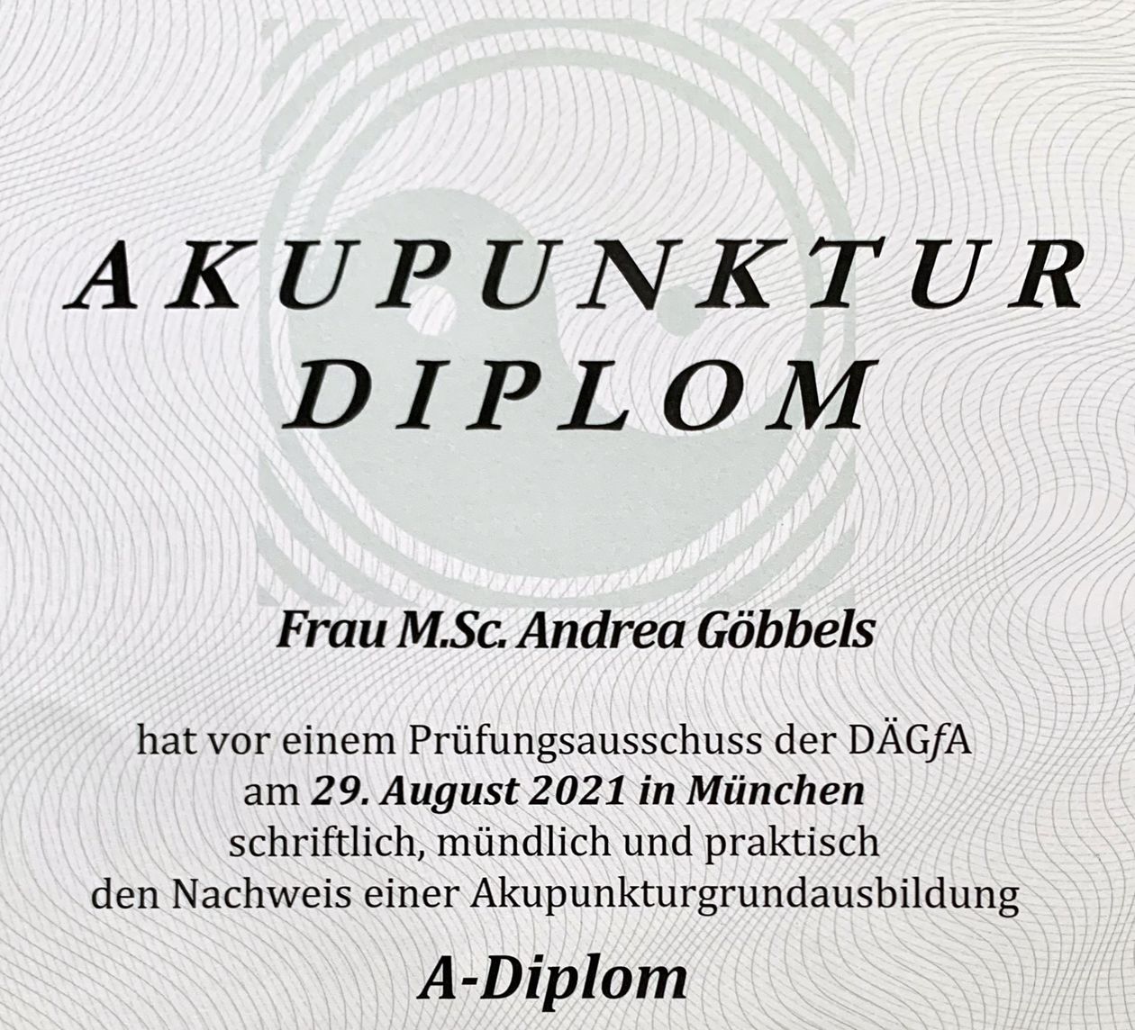 Nach intensiver Ausbildung sowie schriftlicher und mündlicher Prüfung das A-Diplom Akupunktur in der Tasche!
