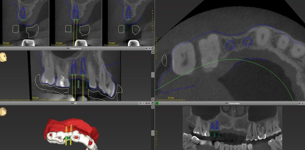 Mittels 3D-Röntgen (DVT - Morita X800) und digitaler Rekonstruktion (CoDiagnostiX) bestimmen wir vorab die optimale Position der Implantate virtuell am Computer. Diese Position wird später passgenau mit Hilfe einer Navigationsschablone in den Mund übertragen. So erhöhen wir die Sicherheit der Implantation für Sie auf ein Höchstmaß. Des Weiteren verkürzt diese Vorgehensweise die Zeit des Eingriffs, verringert die Wundfläche und begünstigt die Heilung. Genügt das Knochenangebot für eine Implantation einmal nicht, dann kann dieses mittels Knochenaufbau ggf. durch Unterstützung unserer Kollegen in der Kieferchirurgie verbessert werden.